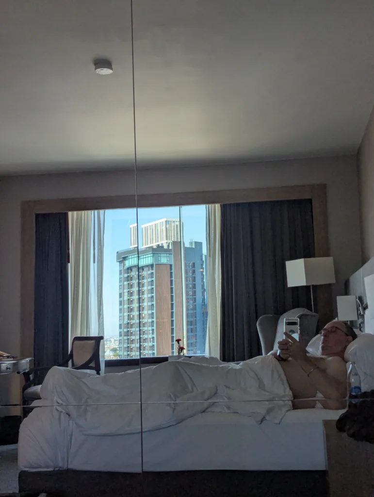 The hotel room doesn’t have an interior window to the bathroom, this being an old-fashioned, civilised hotel, but the wall next to the bed, my side, is mirrored. Again, sounds sexy, but I remember a day back in my mid 20s when I was banging my girlfriend of the time and caught a glance of us in the mirror. She looked great, I looked like shit. I don’t want to see fat me in the nude and I probably don’t want to see our new friend’s surgical dressings falling off so the FFM thing stays on the bucket list for now.